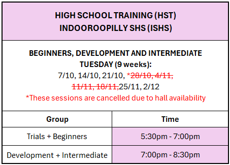 HST at Indooroopilly SHS is cancelled Tuesday 28/10/2025.