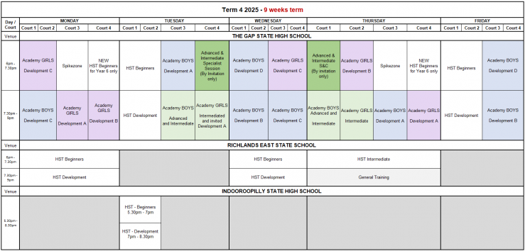 Training schedules across the week for Academy, High School Training (HST), Spikezone (SZ), and General Training.